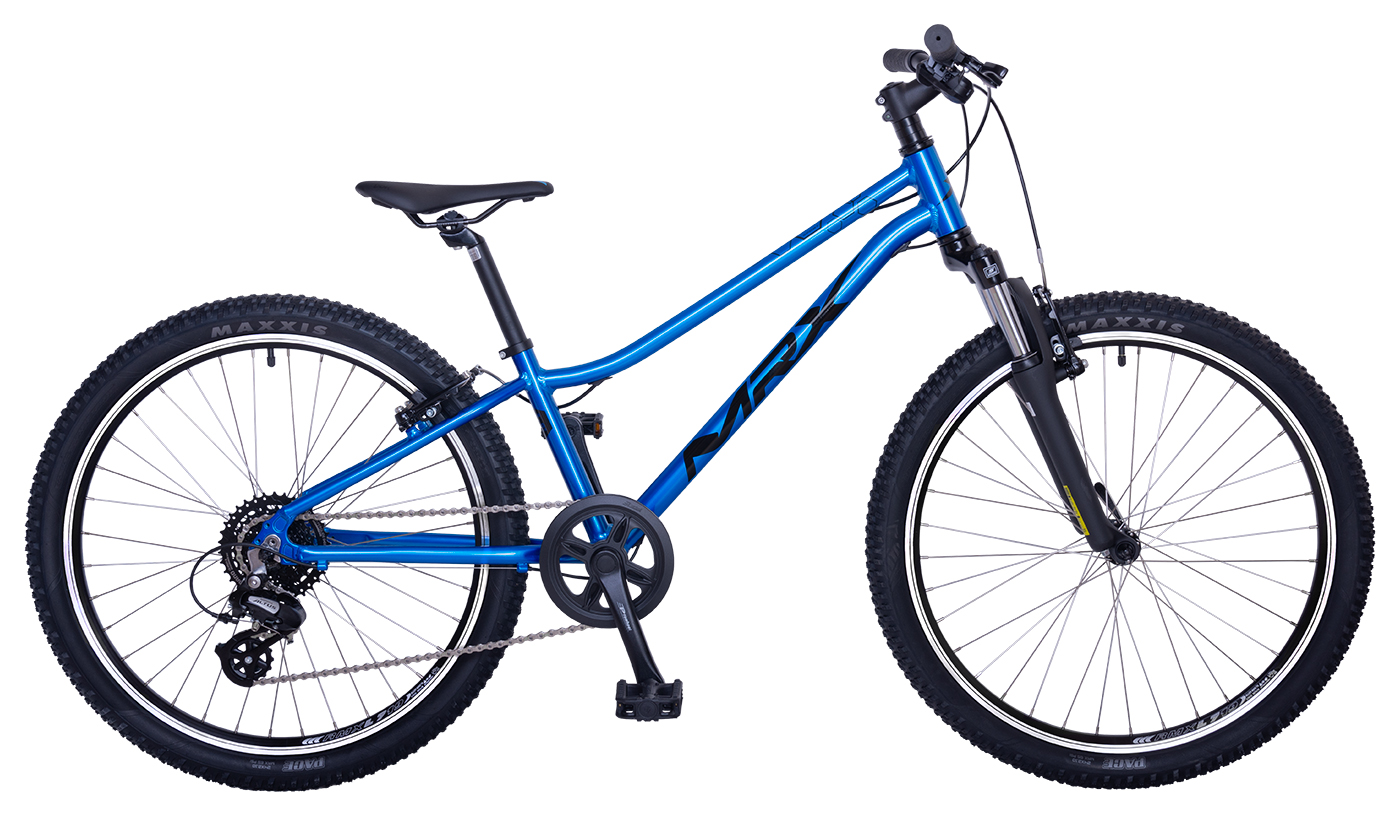 Dětské kolo české značky MRX, kola průměr 24" rám Al. velikosti 11" (280mm) odpružená vidlice Suntour, výbava Shimano převody 1x8 28x11-34z váha 10,6kg. Pro děti velikosti cca 120 - 135cm. Novinka značky MRX pro rok 2025, ložiskové náboje pro hladký chod, integrované vedení (bowdeny řazení/brzd) pro čistý vzhled, tři barevné provedení, atraktivní design, nízká váha a cena.