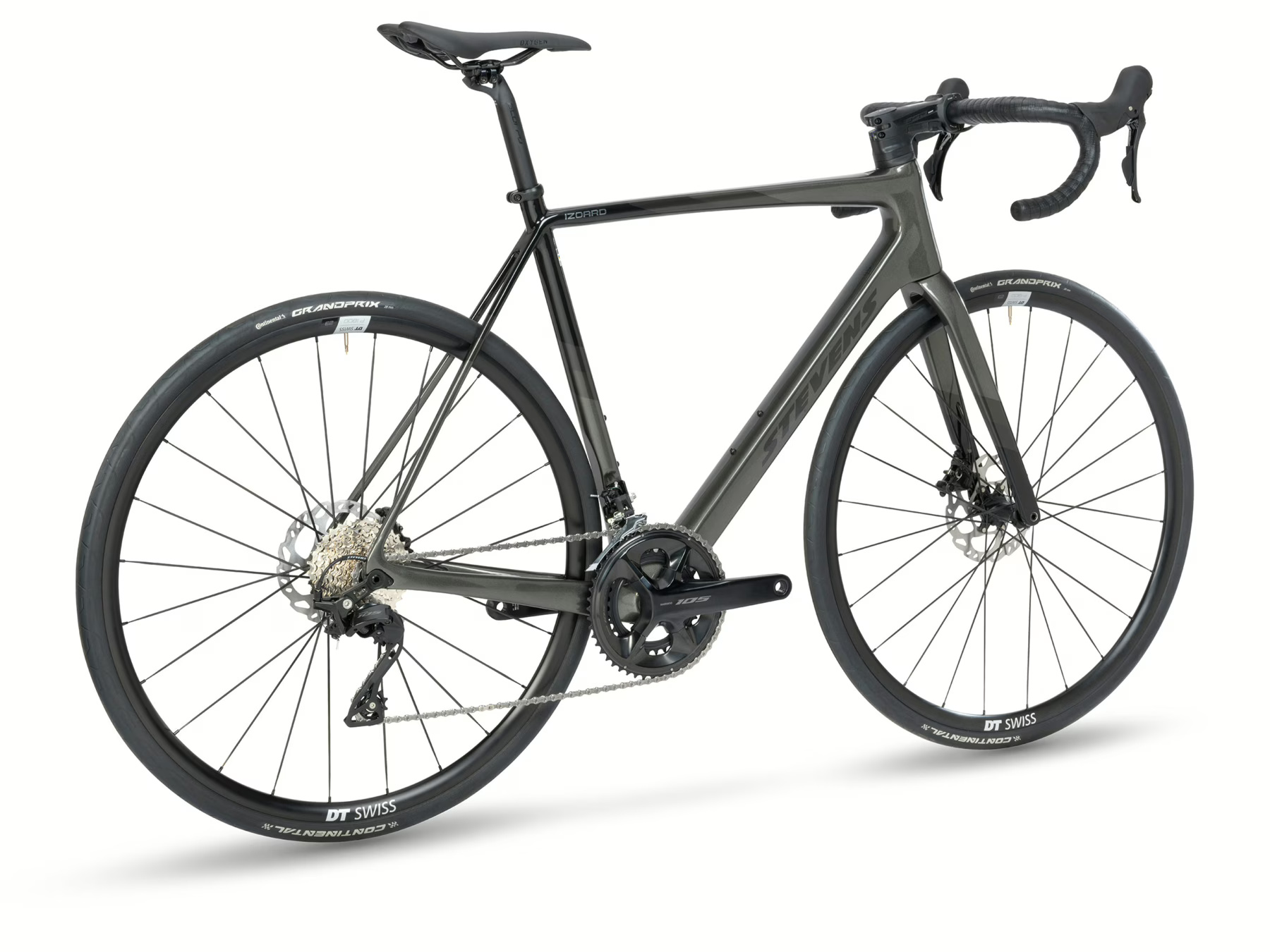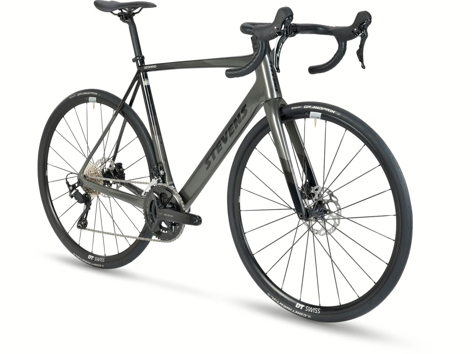 Silniční kolo STEVENS Izoard Golden Grey s karbonovým rámem a vidlicí, Shimano 105 2x12rychlostní sadou a hydraulickými kotoučovými brzdami. Ideální volba pro ambiciózní jezdce hledající profesionální výkon a stylový design.